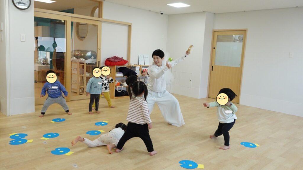最初は、足元を泳ぐおさかなさんたちを踏まないように気を付けながら、みんなも動き回ってみましょう。途中で止まってポーズを決めたり、もっと早く走ったり…さっそく大盛り上がりです。