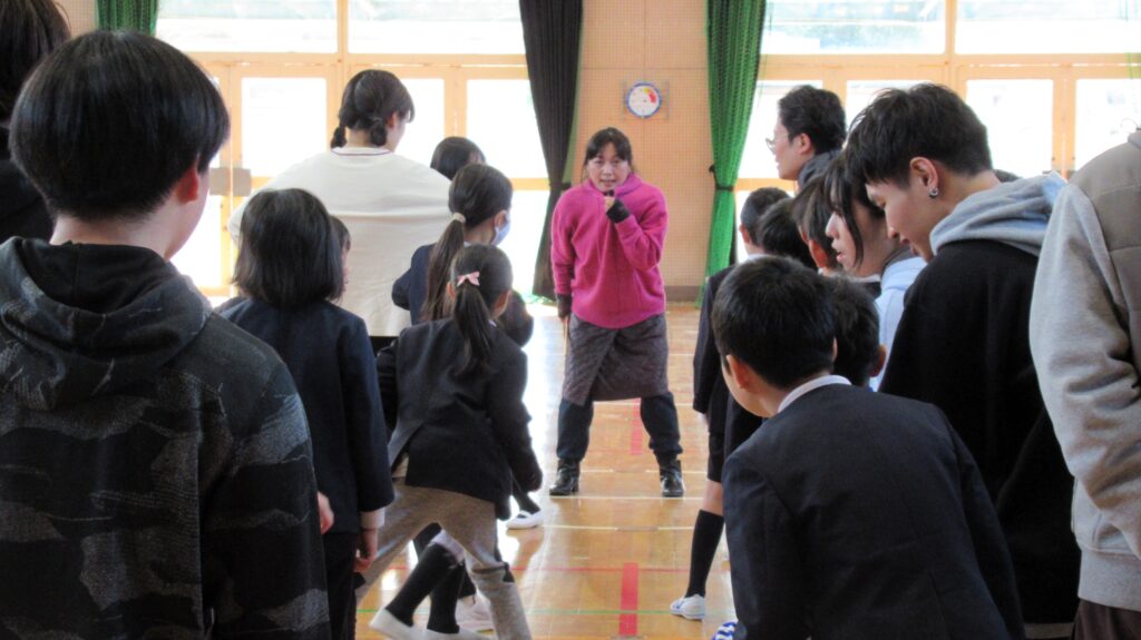 学校にやって来たのは、講師の岩橋由梨さん(表現教育家)と、高校などで演劇を学んできた大学生のお兄さん・お姉さんたちです。