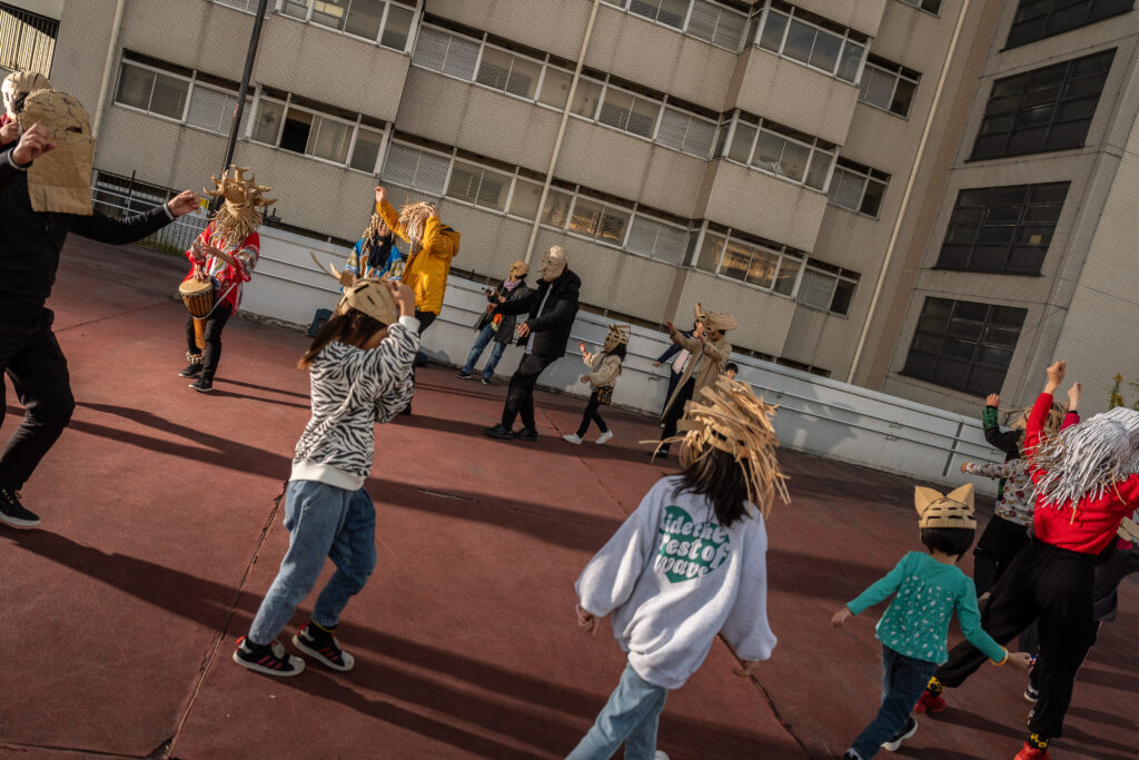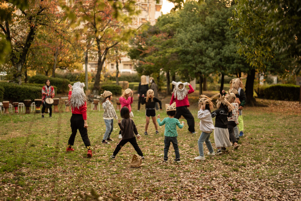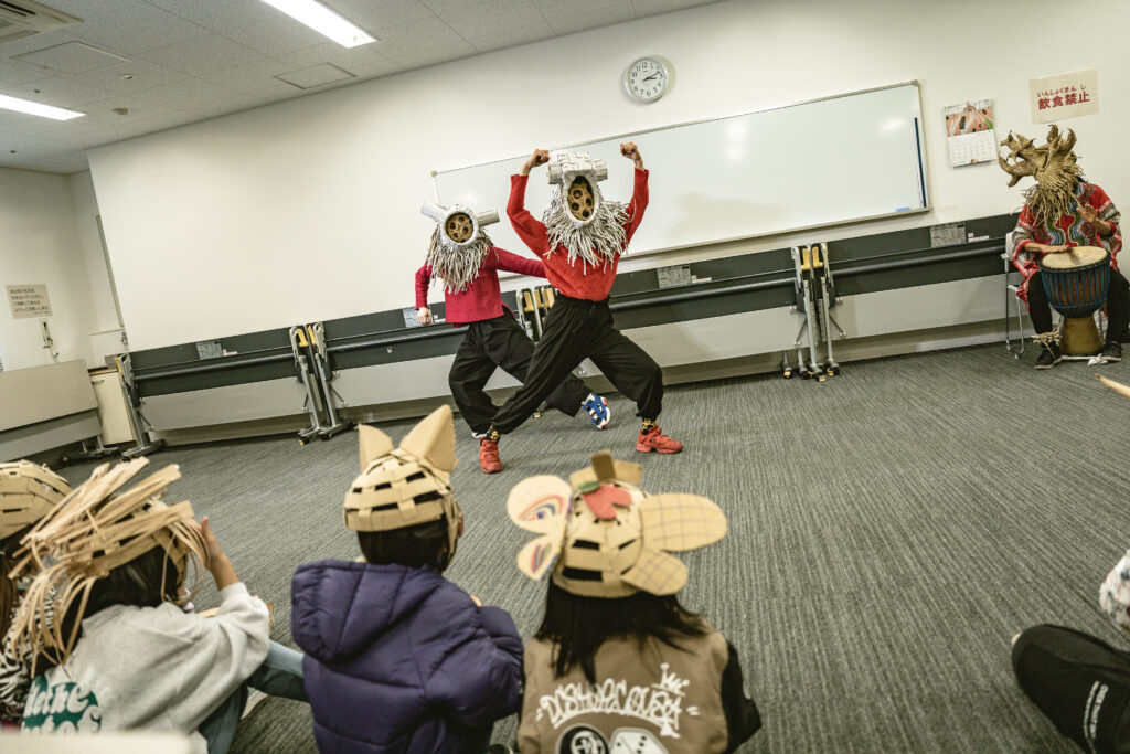お面を被って変身し、ドラムの音が身体に響くと、みんなの気持ちも高まってどんどんオリジナルのポーズが出てきます。