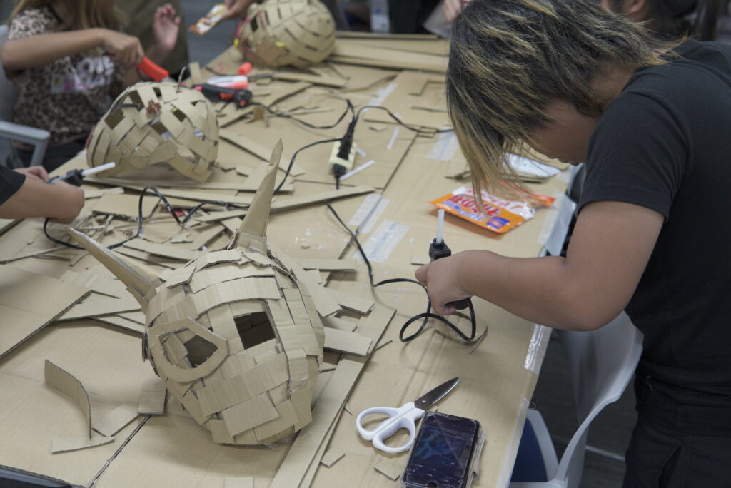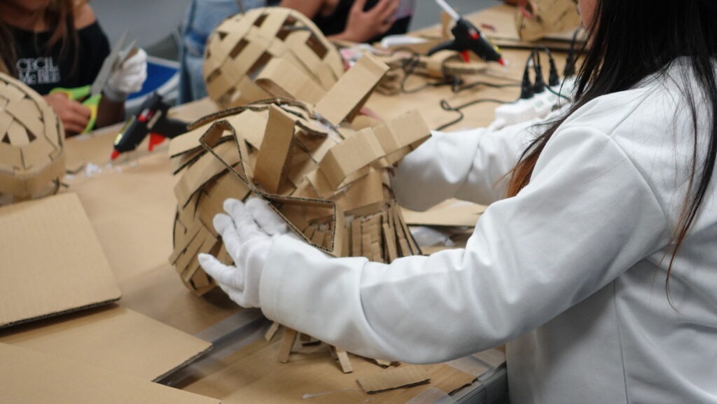 難しいかな、と思う作業にも果敢に取り組み、井上さんや近くの大人と協力しながらお面を作りこんでいきます。