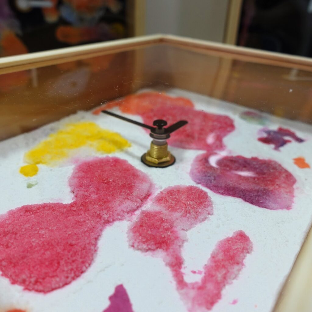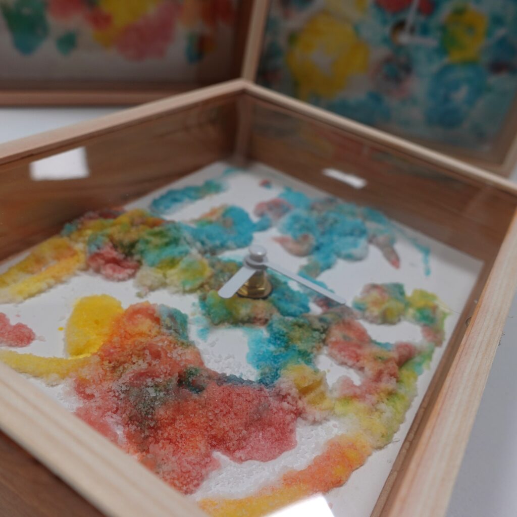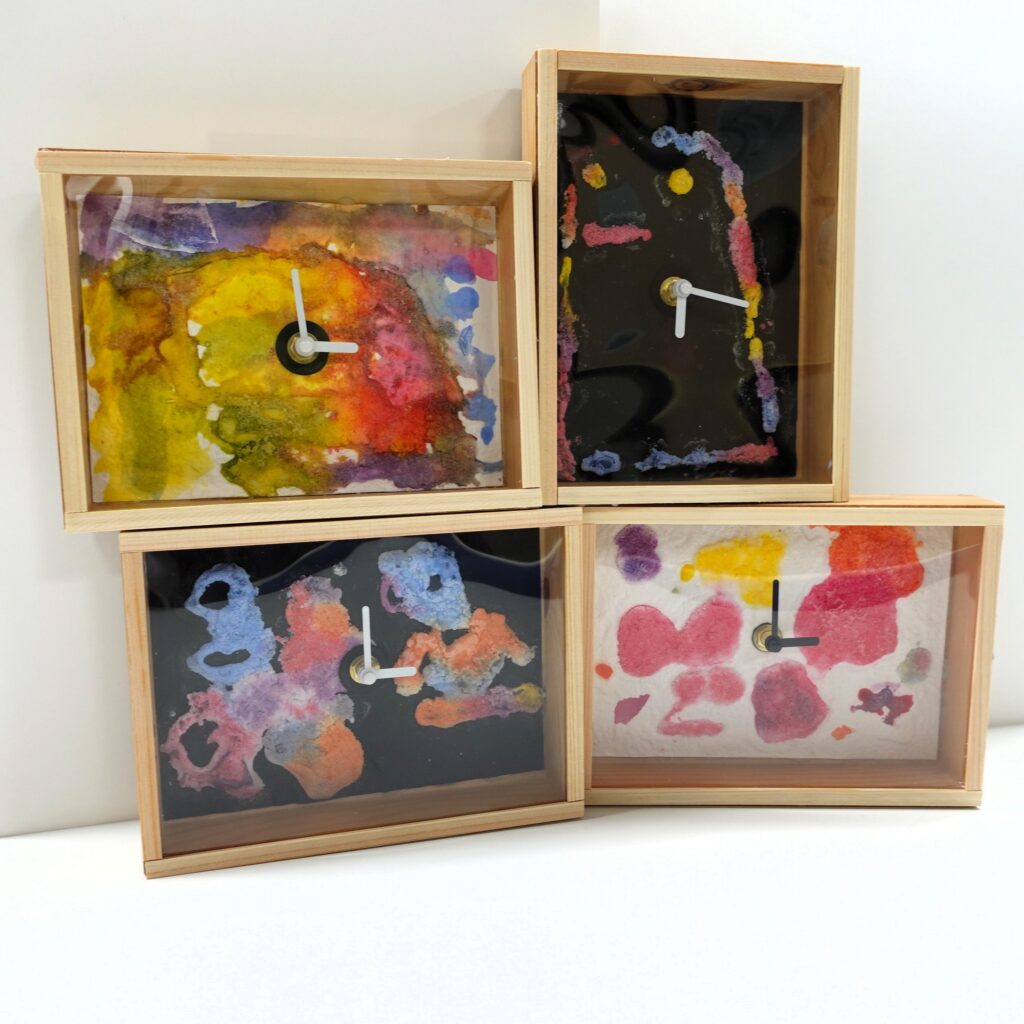 アクリル絵の具&ボンドを使用した作品は色彩豊かに、塩の結晶がキラキラしています。でんぷん糊&透明水彩絵の具で制作した時計は、柔らかい色合いで、でんぷん糊ぷっくり感も残っていました。