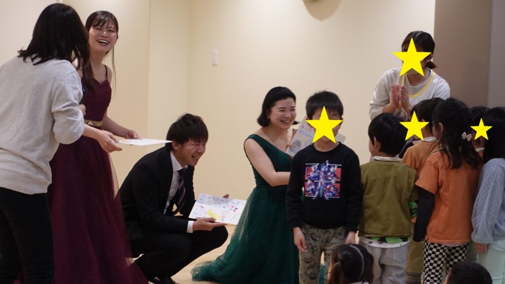 最後には、みんなで書いたありがとうの色紙を渡し、園に来てくれたお姉さんお兄さんと記念撮影。