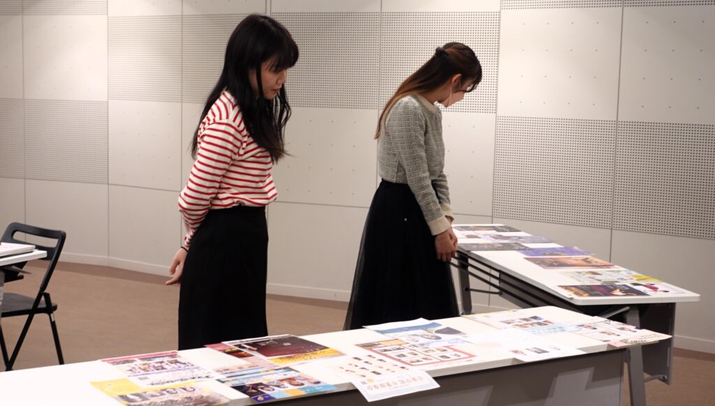 いろいろなチラシを見ながら、色味やフォント、文字の大きさ・配置などを考えていきました。財団職員からは、ユニバーサルデザインの話も共有しました。