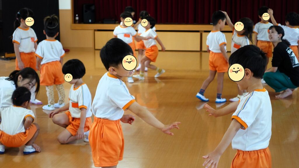 合図に合わせて動いて…とまって…次は片足をあげてストップ!○○のポーズでストップ!など、全身を動かしました。