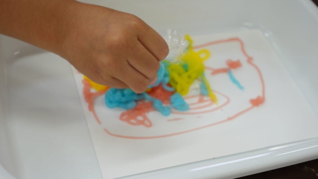 画用紙にぎゅーっと握って絞っていきます。弱く握ると細い線が描けるし、ぎゅーっと握ると紙の上に糊のお山ができます。