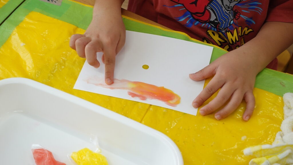手で握ったり、塩を振りかけて色を重ねたり、いつもとは感覚を使ってお絵描きができました!