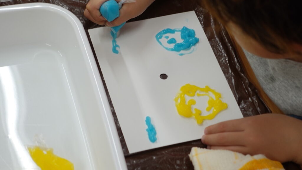 まず使うのは、赤、青、黄色の透明絵具で着色したでんぷん糊。