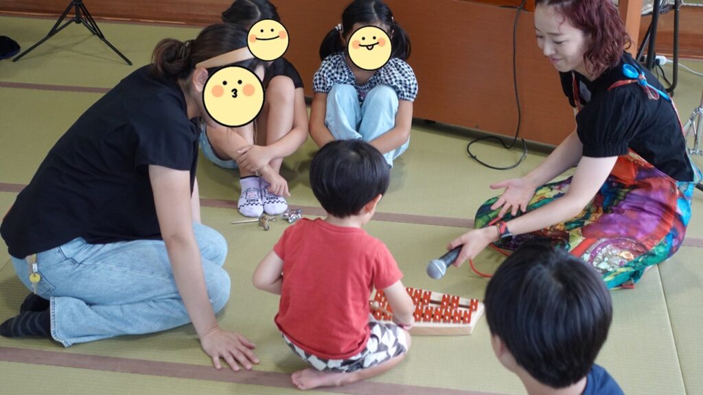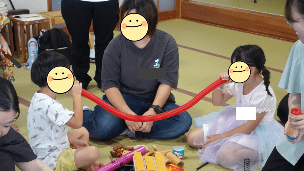 全員に楽器が行き渡ったら、即興でフルーツジュースの歌を作ってみんなでシャカシャカしながら歌いました!