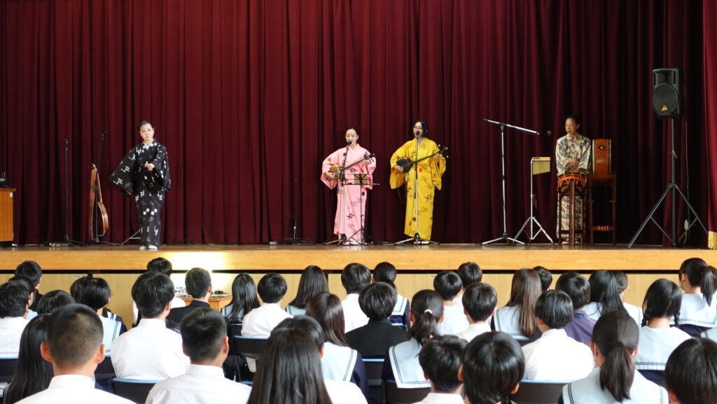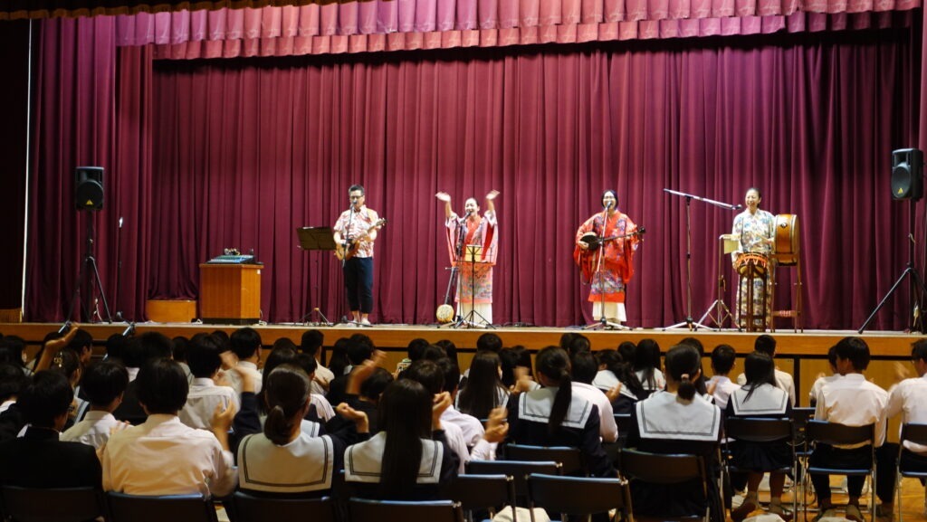 今回は、「いちゃりばちょーでー(出会えば兄弟)」というテーマで企画された沖縄民謡・舞踊の鑑賞プログラムを、中学2年生に向けて実施しました。