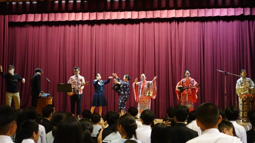 最後はライブスタイルで演奏。『島唄』や、「ゆいまーる(助け合い・支え合い)」という言葉が元になった歌『ユイユイ』などが演奏され、最後は「喜びや悲しみをかき混ぜてみんなで分かち合おう」という思いが込められたカチャーシーを、生徒も一緒になって踊りました。