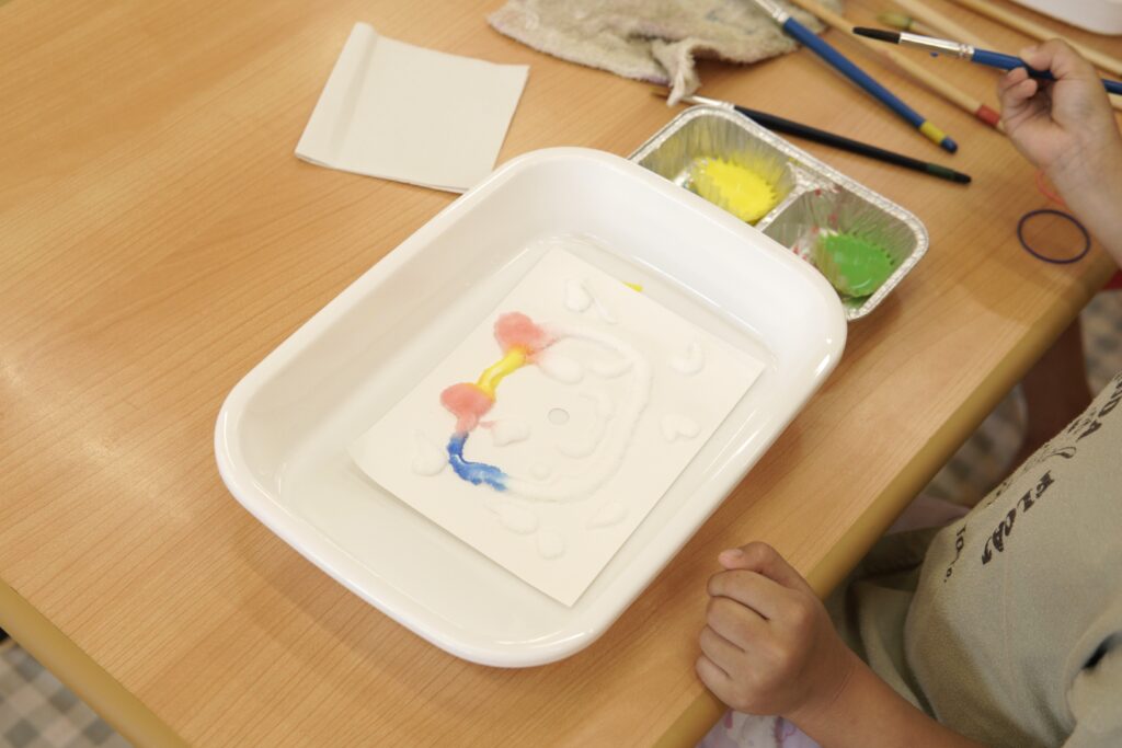 塩にじわじわと絵の具の色が広がっていく様子を見て、こどもたちからは「かき氷みたい!」とあちこちで声が聞こえてきました。