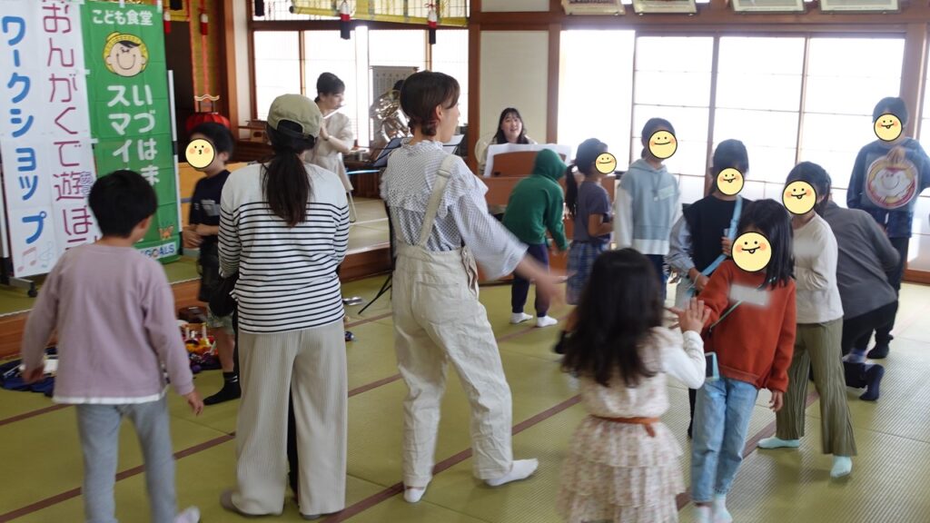 今回から、ユーフォニアムの岩本さんも加わり、フルートの伴さん、ピアノの竹村さんの3人のお姉さんたちが演奏する音楽にあわせて、お部屋を歩きます。