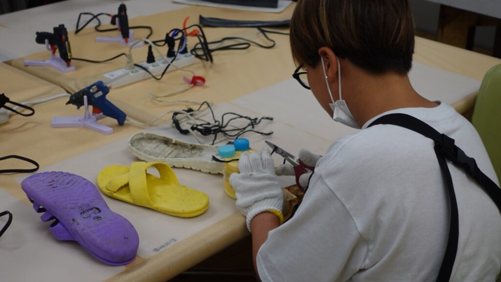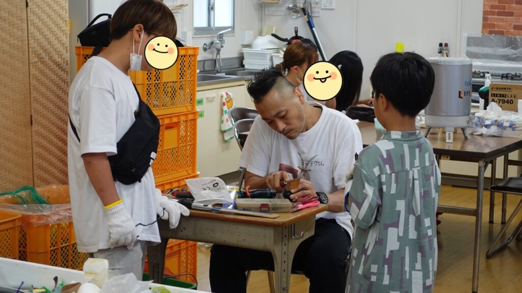 ゴミに穴を空けたり、のこぎりで切ったりする作業は、淀川テクニック 柴田さんにお願いします。工具を使うかっこいい姿に、子ども達も憧れの眼差し…!
