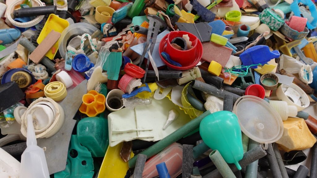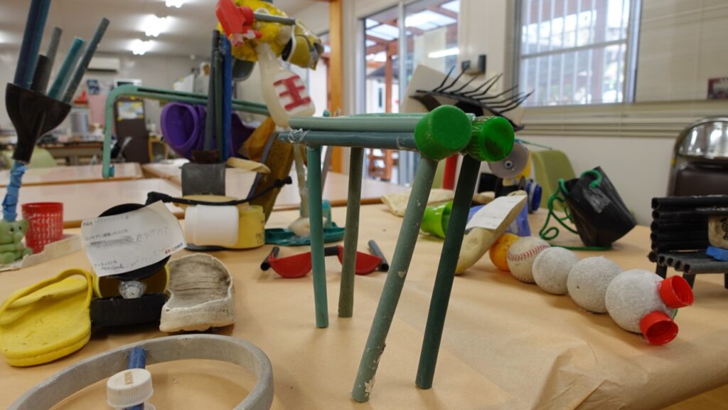 「どのゴミを使おうかな~」と、真剣に悩む子ども達。ゴミの形を見て、何を作るか決まった子もいるようです。