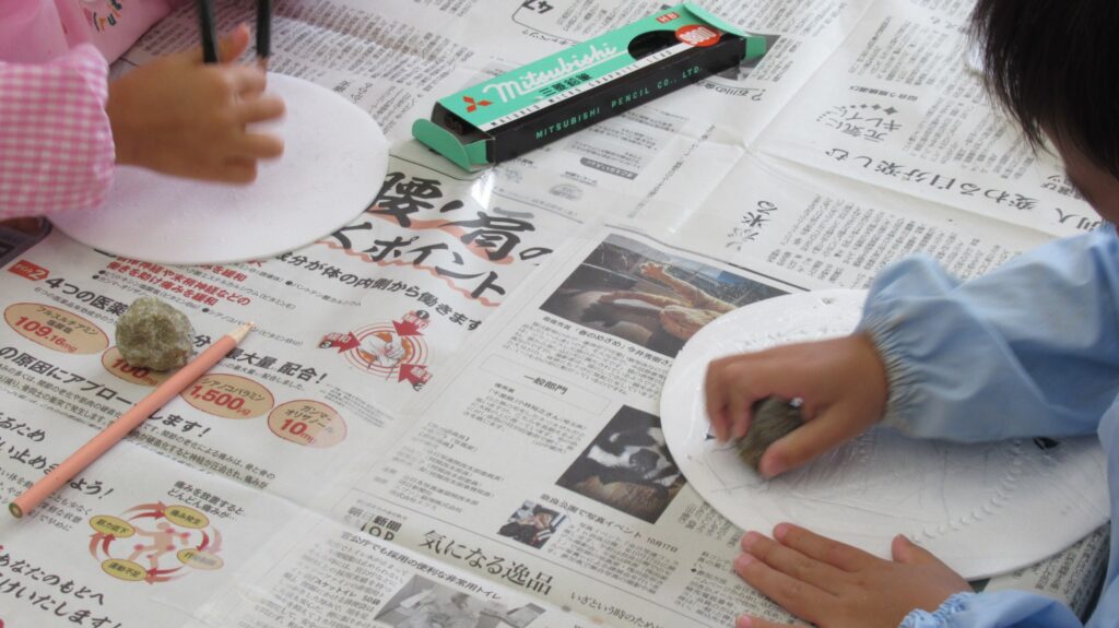 丸っこい形に切られたものから好きな形を選んで、お気に入りの石を使ってガリガリ掘ったり、鉛筆で何かを描いたり、穴をあけたりして、版をつくっていきます。