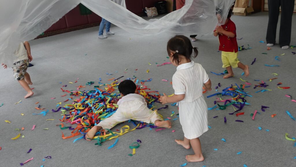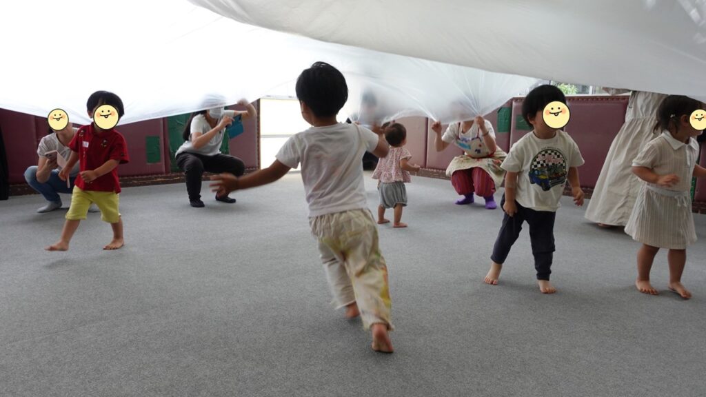 大きく広げたビニールのシートをふわっと動かして、下に入り込んでみたり、上に乗って波の中を走ってみたり、早速大はしゃぎの子どもたち。