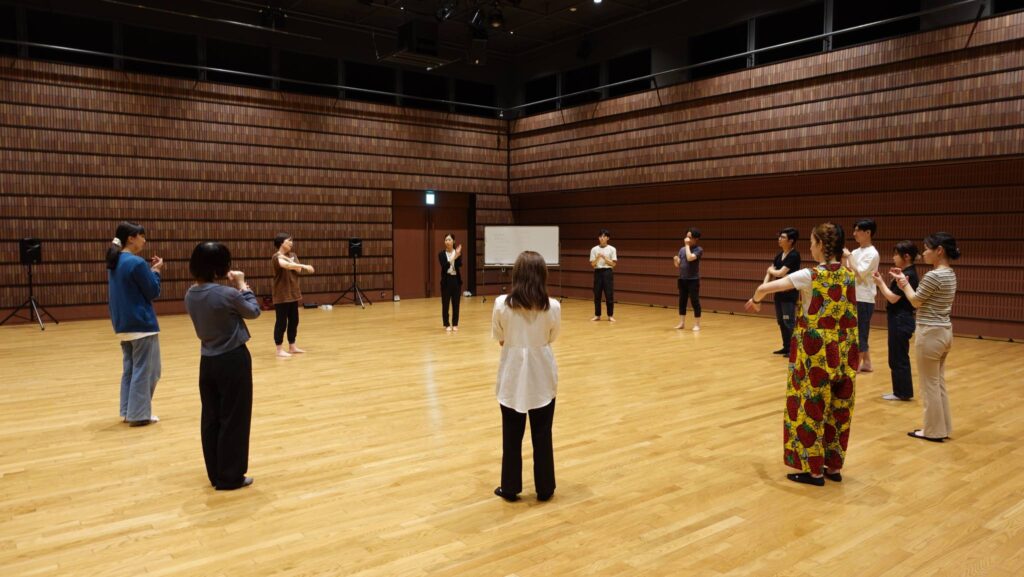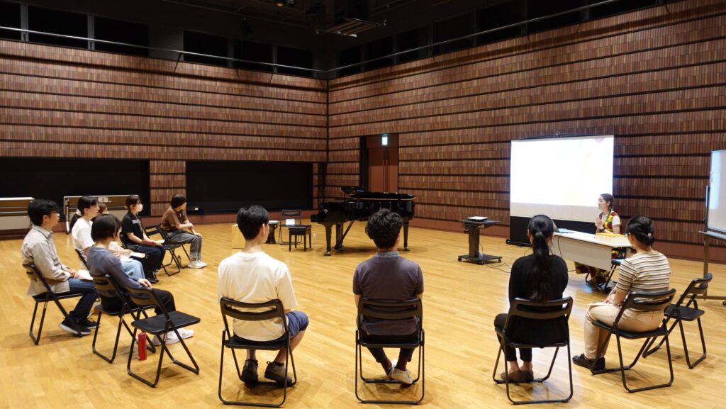 今回は身体、楽器、言葉を使ったワークショップを体験し、言葉を使うことなく、自然と音で会話する場面がたくさん見られました。