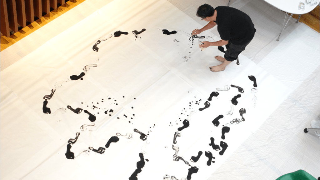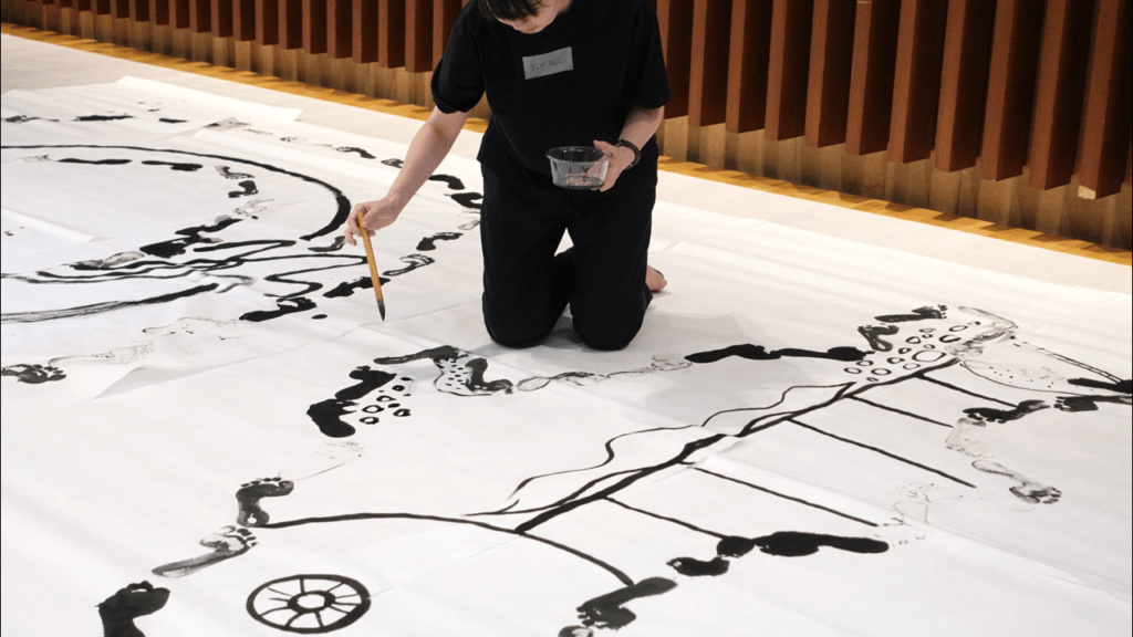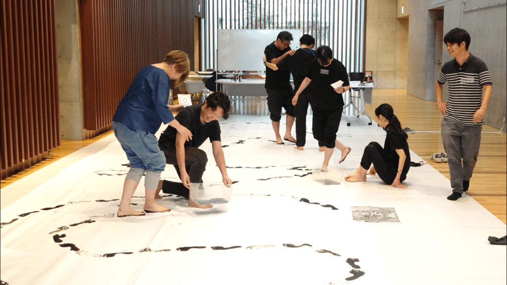 足跡を使って、大きな紙に空想の地図を作りました。不思議な地図ですが、他の人の足跡を辿ってみると、自分とは違う身体の動きを感じることができ、お互いの感覚の違いやその面白さに気が付きました。描く島のかたちを考えたり、墨汁の感触を足で感じたり、実際にどんなふうに描いていくか悩む過程は、自分の気持ちや感覚に向き合う時間にもなりました。