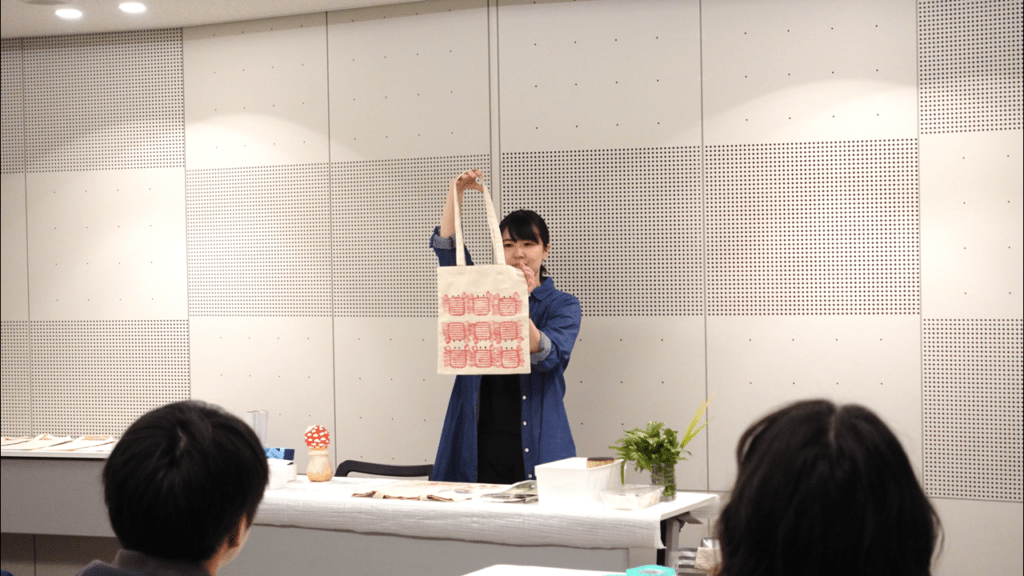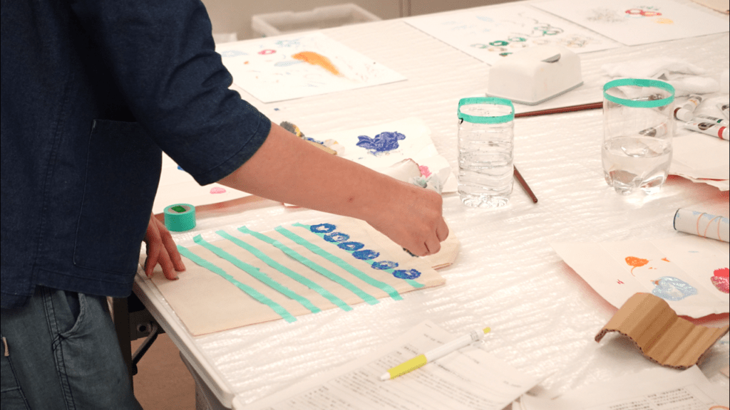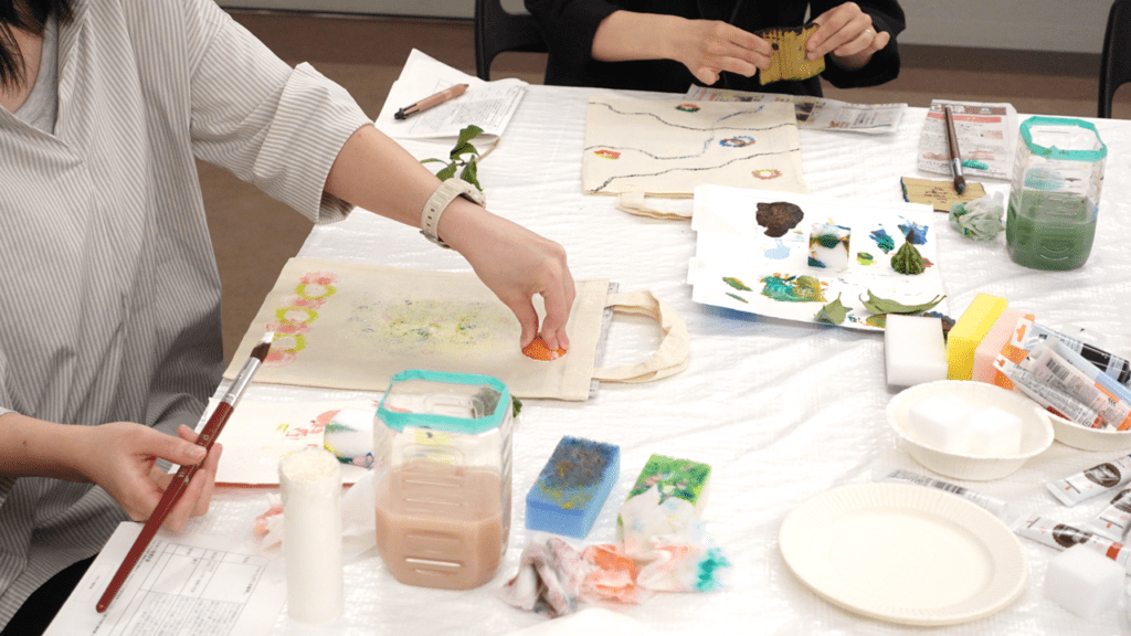 自然の素材と人工の物をスタンプにしてトートバッグを作るワークショップを企画しました。身近なものも、組み合わせや押し方を工夫すると素敵な模様やかたちが生まれます。その中から自分のお気に入りを選び、好きなものを連想しながら表現していきます。持ち運ぶことで自分の「好き」を伝えられるトートバッグが完成し、とてもワクワクした気持ちになりました。