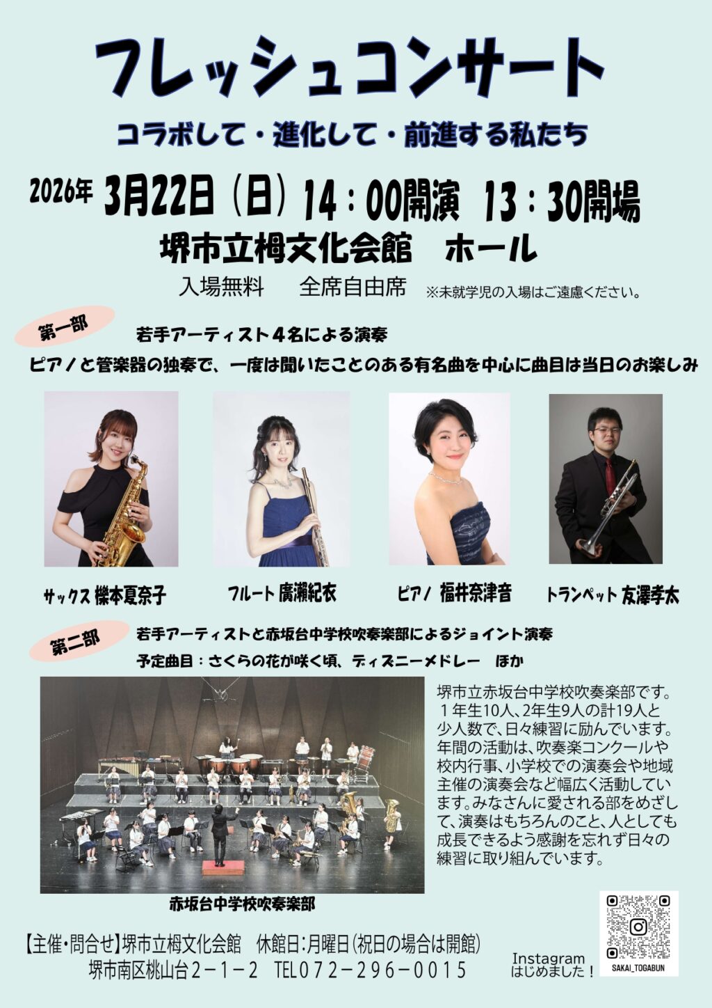 堺市新進アーティストバンク登録者と、地元赤坂台中学校吹奏楽部がコラボレーション!